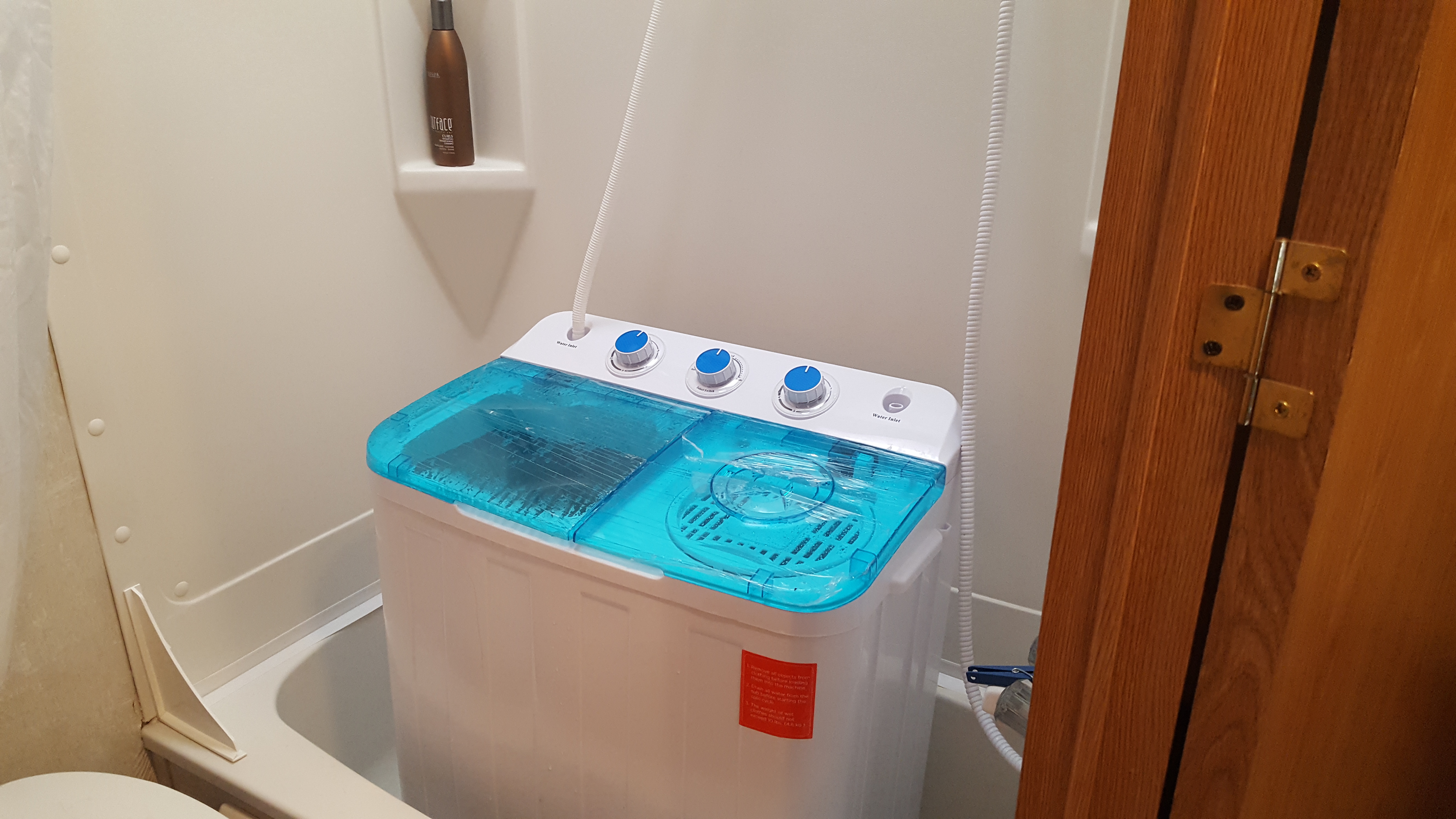 Post ten, “Oops, I meant dirty duds! Not dirty deeds!” Our dirty laundry. Are we still washing it by hand? Nope. That got old quick. But since we still can’t use public washers because of my sensitivities to chemical residues we found an in-between solution. A washer and spinner unit that we pull out from underneath the camper when we need it. (See picture below) Then we either use the closest dryer depending on where we are staying, or hang dry them. It’s still a lot of work (for my husband, he took over the laundry—yea!!!) but it’s worth it.